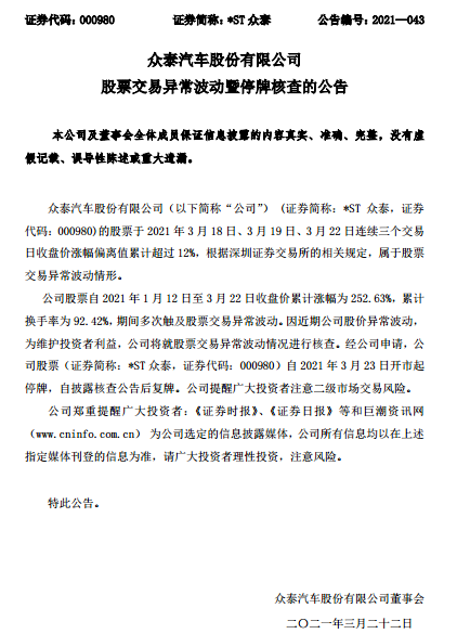 3月22日消息,刚复牌仅3个交易日,妖股*ST众泰因连续涨停再度宣布股价异常波动,停牌核查。
