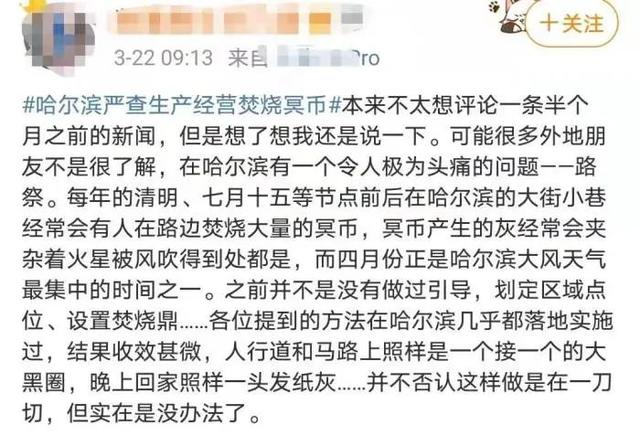 此前,虽然哈尔滨也曾多次发文要求禁止焚烧冥纸冥币,对生产和销售环节也做出过要求,但上述新闻依然引来网友热议。