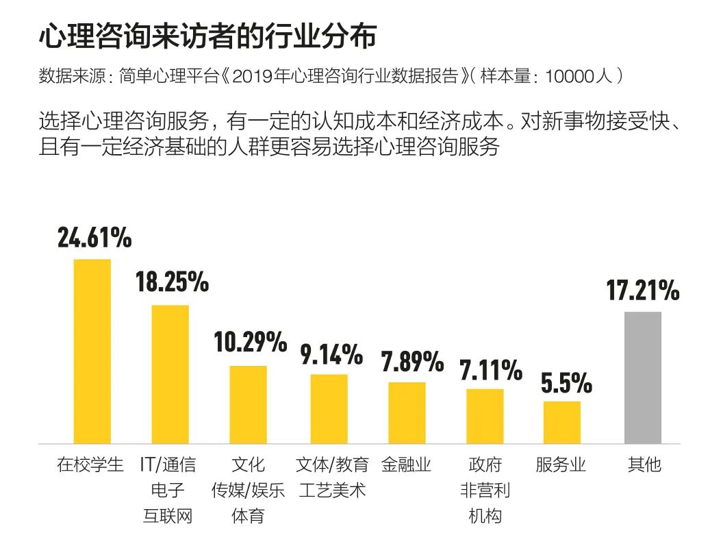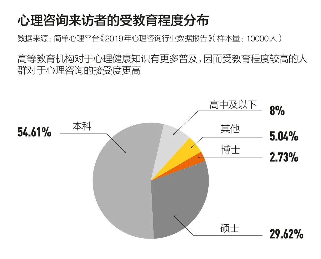 由于心理咨询有一定经济成本,付费咨询人群大多为高收入行业从业者。据《2020大众心理健康洞察报告》,近90%的来访者为本科及以上学历,近五成来访者从事IT、互联网、文体、文化传媒、金融等工作,超过一半的付费来访者来自一线城市。