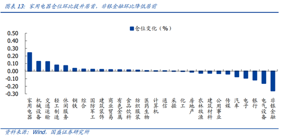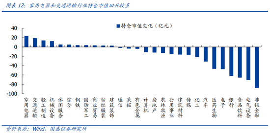 家用电器仓位提升居首,非银金融仓位回落较多。从持股市值变动角度看,上周家用电器、交通运输和轻工制造行业持股市值大幅提升,分别增加23.01亿元、18.34亿元和13.39亿元;同时非银金融、电气设备和食品饮料行业持股市值回落较多,分别减少87.32亿元、70.25亿元和65.18亿元。从持股仓位变动看,上周家用电器、机械设备和交通运输行业仓位提升较多,分别提升0.24%、0.13%和0.12%;而非银金融、电气设备和银行行业仓位回落较多,仓位分别下降0.26%、0.16%和0.12%。