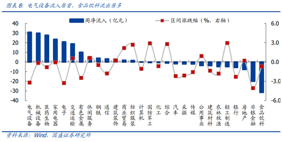 北上集中加仓电气设备和机械设备等行业。根据我们的估算,上周电气设备、机械设备和医药生物行业净流入居前,分别净流入30.81亿元、29.84亿元和27.75亿元;同时食品饮料、非银金融和房地产行业净流出较多,分别净流出31.58亿元、20.04亿元和7.8亿元