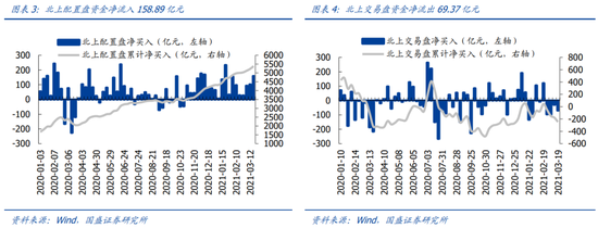 北上加速入场,配置盘大幅增配。上周北上连续净流入87.08亿元,南下资金净流入40.59亿元。根据我们对陆股通资金的拆解和估算,北上配置盘净流入规模进一步增至158.89亿元,自去年11月以来已连续20周维持净流入,交易盘本周净流出69.37亿元,配置盘和交易盘今年以来累计净流入分别达到1086.79亿元和-34.78亿元。上周主板和科创板仓位上升,创业板仓位下降,截至3月19日,陆股通主板、创业板、科创板持仓比例分别为87.12%、12.77和0.11%%。