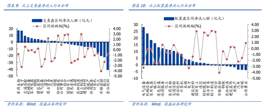 从资金性质拆分看,交易盘主要流入医药生物、电子和交通运输行业,分别净流入16.97亿元、16.43亿元和8.78亿元;同时集中流出食品饮料、银行和非银金融行业,分别净流出40.33亿元、21.56亿元和19.75亿元;配置盘主要流入电气设备、机械设备和家用电器行业,分别净流入27.91亿元、23.09亿元和18.25亿元;主要流出公用事业、传媒和汽车行业,分别净流出3.57亿元、3.37亿元和3.24亿元。