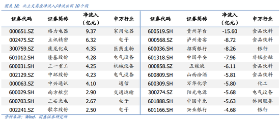 从整体净流入看,上周格力电器、三一重工、隆基股份、广联达、宁波银行净流入居前,分别净流入24.03亿元、9.85亿元、9.35亿元、6.32亿元、5.81亿元;同时贵州茅台、泸州老窖、中国平安、山西汾酒、兴业银行减持较多,分别净流出23.02亿元、9.01亿元、7.43亿元、5.93亿元、5.59亿元。