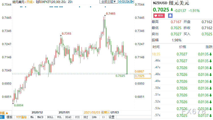 现在的纽元早已跌破了100天移动均线支撑位0.7115,因此将能再次试探0.70附近的支撑位。一位驻亚洲的外汇交易员称,杠杆基金增加纽元空头头寸,触发