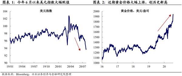 近期美元指数大幅贬值,而黄金价格创下历史新高。近期美元指数出现大幅贬值,美元指数从3月19日的高点102.8下跌至7月27日的93.5,其中跌幅较快的时期是从5月底至今。同时黄金价格出现快速上涨,7月27日已创下1942美元/盎司的历史新高。