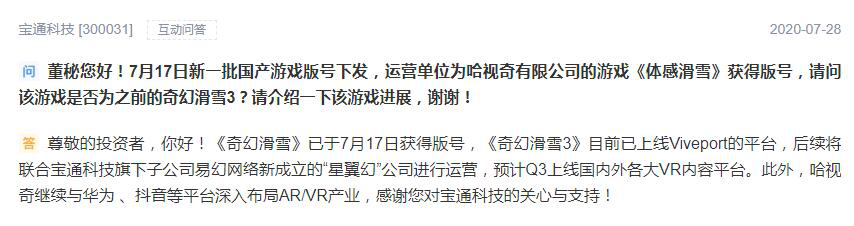 此外,宝通科技还透露,哈视奇牵手华为、抖音。7月28日,宝通科技在深交所互动易平台回复投资者提问时称,《奇幻滑雪》已于7月17日获得版号,《奇幻滑雪3》目前已上线Viveport的平台,后续将联合宝通科技旗下子公司易幻网络新成立的“星翼幻”公司进行运营,预计第三季度上线国内外各大VR内容平台。此外,哈视奇继续与华为 、抖音等平台深入布局AR/VR产业。