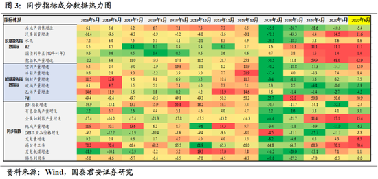 我们看到,同步扩散指数与领先指数相互印证,提示经济动能短期回暖依然强劲(图 2)。从热力图中(图 3),我们也看到,空调、冰箱、纯碱等生产明显加快,BDI指数也回升,但钢材、玻璃、乙烯、金属切割器、有色、发电耗煤增速边际初现趋缓。