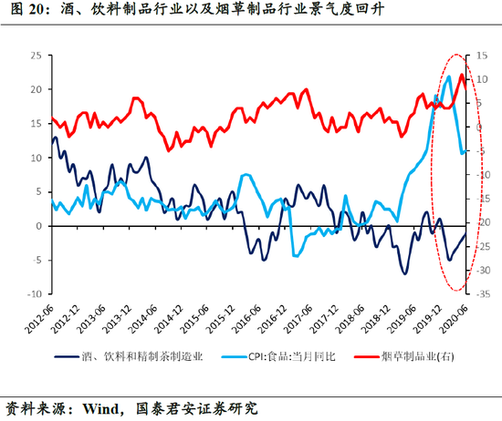 链条2 – 烟酒类链条:6月南方洪涝灾害对短期食品CPI产生小幅扰动。受此影响,叠加复工复产后,国内餐饮、娱乐需求进一步复苏,酒、饮料制品行业以及烟草制品行业景气度延续5月回升态势(图 20)。