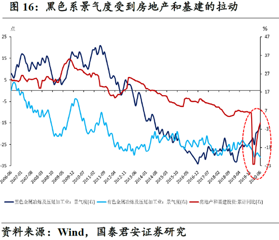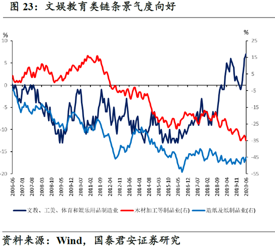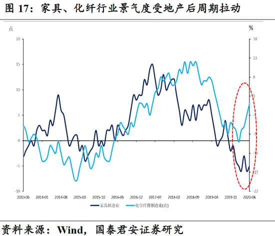 链条1 – 地产与基建的建筑链条:黑色金属冶炼及压延加工业包括炼铁、炼钢、钢压延加工和铁合金冶炼四个中类行业。黑色系在6月大幅改善,景气已经处于历史高位,明显印证建筑业施工强度增大。此外,地产后周期行业也随着竣工与交付不断改善。家具亦小幅回升,化纤行业亦大幅回升(图 17)。