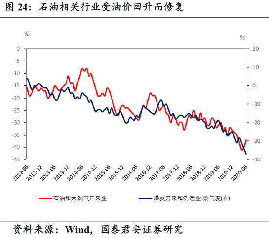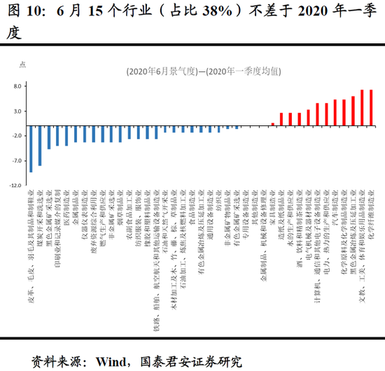 我们发现,6月具体行业修复强于5月的主要在:石油和天然气开采业、酒、饮料和精制茶制造业、烟草制品业、家具制造业、造纸及纸制品业、文教、工美、体育和娱乐用品制造业、化学原料及化学制品制造业、医药制造业、化学纤维制造业、黑色金属冶炼及压延加工业、通用设备制造业、汽车制造业、电气机械及器材制造业、计算机、通信和其他电子设备制造业、电力、热力的生产和供应业。