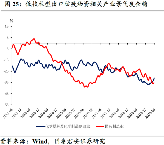 景气小幅改善的链条:“宅经济”中的远程办公设备(如笔记本电脑、平板电脑等)、医疗器械拉动部分高技术密集型行业修复,以及防疫物资拉动部分低技术出口行业;