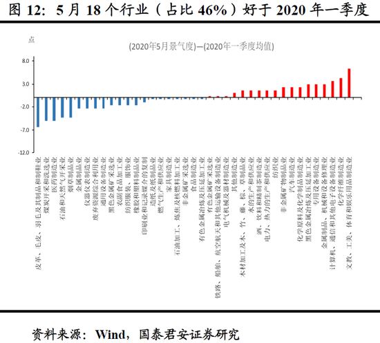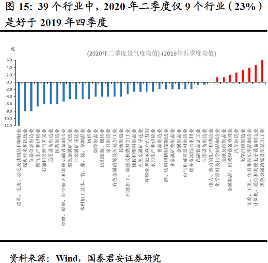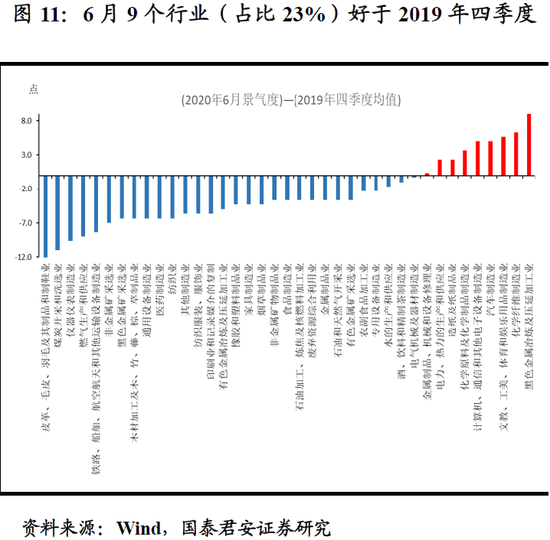 在月度层面,相比较疫情中(2020年一季度),39个行业中,6月有15个行业(占比38%)景气度改善(图10),占比略低于5月(5月有18个行业(占比46%)好于2020年一季度(图12);但是,相比较疫前正常水平(2019年四季度),6月有9个行业(占比23%)好于2019年四季度(图11),而5月仅8个行业(占比21%)好于2019年四季度(图13)。并且,我们发现,与基建、地产相关密切的黑色金属冶炼及压延加工业修复速度再次加快,在6月反超文教、工美、体育和娱乐用品制造业、化纤行业,位列第一。