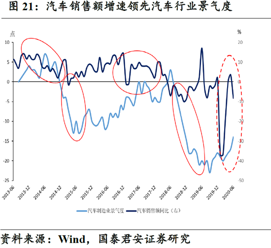 链条3 - 汽车链条:6月汽车制造业景气度持续5月修复态势。但6月社零数据显示汽车销售略有回落,前期需求反弹告一段落。鉴于销售增速对汽车行业景气度的领先性,我们预计后续汽车行业景气度会短暂回落(图21)。