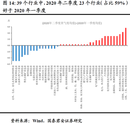相比较疫情中(2020年一季度),39个行业中,2020年二季度有23个行业(超过2/3)的景气度改善,明显改善的行业有文教、工美、体育和娱乐用品制造业,计算机、通信和其他电子设备制造业、黑色金属冶炼及压延加工业。疫情后期,高技术制造业、互联网行业以及交通运输业都在近月回升明显。而大部分景气度不及一季度的行业为受石油价格下降影响严重的石油天然气开采业,受出口下滑严重的低技术行业,反映了国内外疫情的错位影响效应(图 14)。
