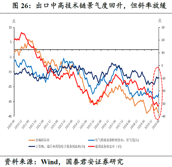链条5 - 出口链条:当前出口相关联行业,传统制造领域景气度基本位于历史较低分位水平,海外疫情冲击叠加中美贸易摩擦,一方面拖累传统低技术出口,但另一方面,防疫物资、医疗器械等出口拉动又使化学原料、医药制造等行业景气度企稳(图25)。整体高技术链条修复良好,但仍然维持在历史地位。未来,随着防疫物资出口下降以及外需逐渐修复,高技术行业,如ICT等,有望逆势回升。但高技术行业受贸易摩擦直接影响,鉴于我们新经济动能的结果,我们认为,后续应持续关注这一行业(图26)。