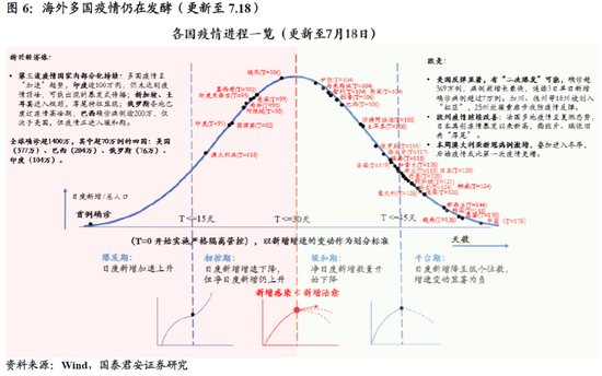 这似乎非常矛盾,但实际符合逻辑。首先,6月出口大超预期主要是因为海外疫情再次发酵恶化(图6、图7),防疫物资、居家办公等“宅经济”产品出口大超预期。而非疫情相关产品的出口,反而因疫情影响外需,进而成为拖累,而与新经济紧密相关的出口恰恰是这些非疫情相关产品,如机电与ICT等高新技术产品。6月份对于新兴产业而言,正好处于国内需求反弹告一段落,国外需求未起的“空窗期”。EPMI,中国战略性新兴产业采购经理指数(EmergingIndustries PMI)说明的是“科技”的景气程度。该指数在6月超季节性回落。其中,该指数的新产品研发项目与近年均值相比出现明显回落。中国科学技术战略发展研究院解读为这反映了我国受制于国外技术减供。