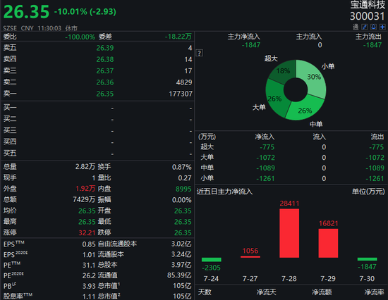 7月30日早盘开盘,宝通科技股价果然一字跌停。