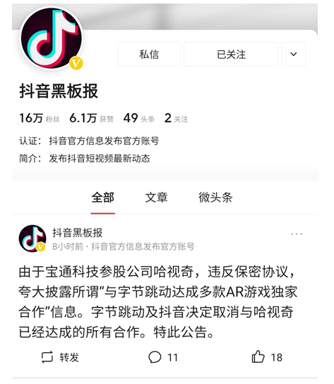 7月29日晚间,一则公告让股民们炸锅了。据抖音官方发布称,由于宝通科技参股公司哈视奇违反保密协议,夸大披露所谓“与字节跳动达成多款AR游戏独家合作”信息,字节跳动及抖音决定取消与哈视奇已经达成的所有合作。