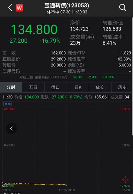 在正股跌停的影响下,宝通科技可转债也遭遇了巨大的抛压。当天上午,宝通转债跌超16%以上。