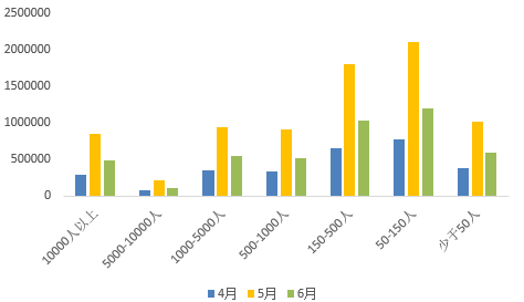 同时,也对各类规模的企业招聘的需求量做了统计与分析,根据监测数据发现,不同的企业规模呈现出来的企业招聘需求量有所差异。