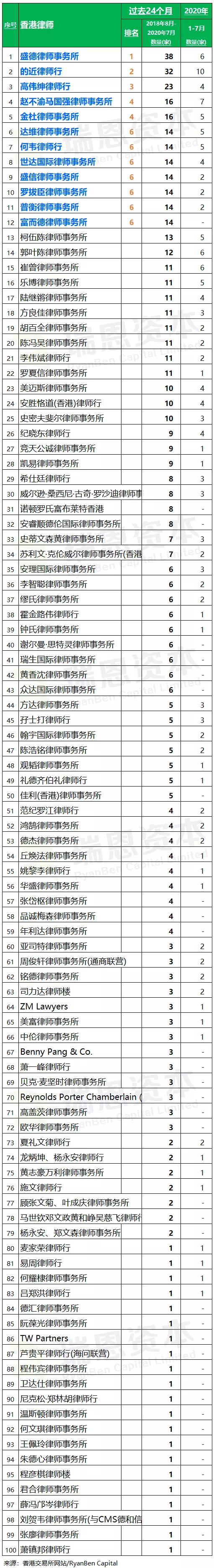 就2020年前七个月的数据来看,63 间香港律师参与了83家IPO项目,表现最好的是的近 (10家、占12%),排在第二的则是赵不渝马国强 (7家、占8.4%),盛德、郭叶陈、崔增则各以6家并列第三,金杜香港、达维、何韦、柯伍陈、乐博则各以5家并列第六。