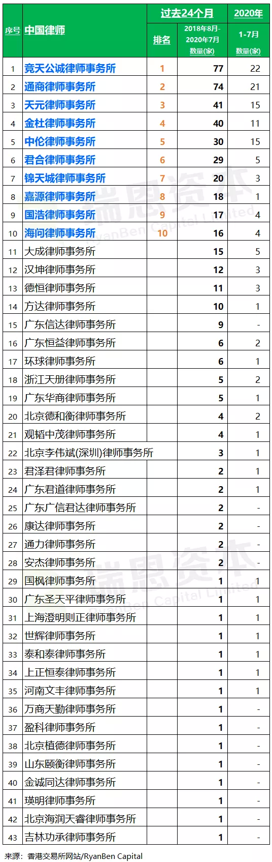 根据统计,在过去的24个月(2018年8月-2020年7月),共有 43 间中国律师参与了 246 家(230家主板、16家GEM涉及到中国业务或资产)新上市业务。由于28家创业板转主板的律师资料有些无法从公开渠道获取,所以我们在编制排行榜时,涉及GEM(创业板)转主板的律师业务不包括在内。RyanBen Capital汇总编制排名如下: