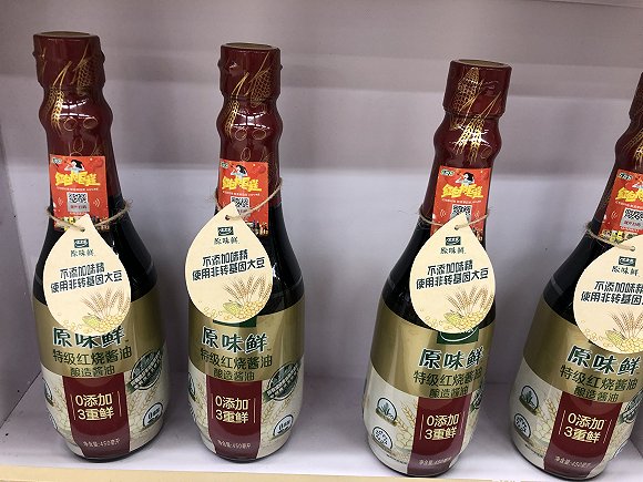 上:光明如实2017年的包装(图片来源:微博@光明乳业) 下:如实现在的包装 (图片拍摄:马越)“不含转基因”“非转基因”的标注,还出现在食用油、酱油等产品上。界面新闻在超市看到,西王玉米胚芽油标注有“非转基因”;太太乐的原味鲜酱油标注有“不添加味精、使用非转基因大豆”的字样。