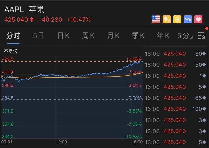昨夜,在亮眼财催化下,苹果大涨10.47%,市值一夜飙升1725亿美金,约合1.2万亿人民币。