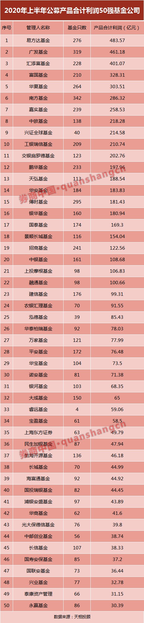 从基金公司来看,上半年盈利前三分别是易方达基金、广发基金和汇添富基金。具体来看,易方达基金旗下276只基金产品,上半年利润总额达到了483.57亿元;广发基金旗下有319只基金产品,上半年利润总额为461.18亿元;汇添富基金旗下228只基金,上半年利润总额为401.07亿元。