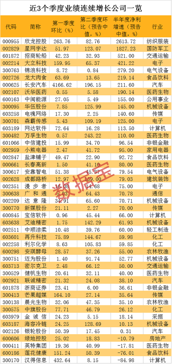 证券时报·数据宝统计,已有1700多家公司发布2020年半年度业绩、业绩预告,剔除st股,数据显示近三个季度业绩环比连续增长的公司有45家。其中万孚生物、长安汽车和成都路桥等公司第二季度的净利润环比增幅最大,分别高达243.22%、196.15%、159%。