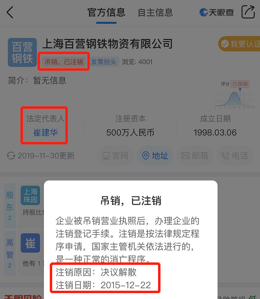 “天眼查”显示这个公司成立于1998年3月6日,已于2015年12月22日注销,并于2018年12月24日完成了清算,清算组负责人为崔建华。