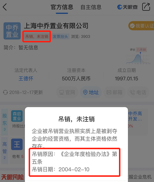 再查看上海中乔置业情况,该公司成立于1997年1月,目前也是“吊销、未注销”状态。