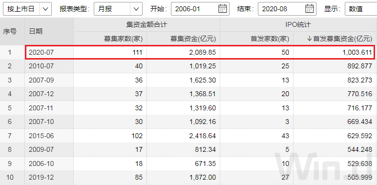 7月份有50只新股上市,创三年多新高,同时募资金额1000亿元,并创出历史新高。