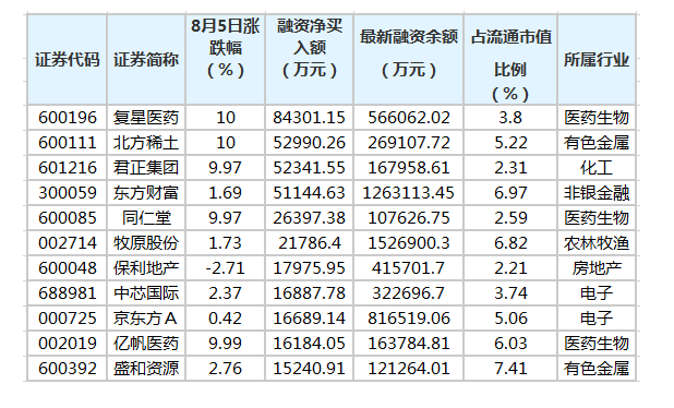 据数据宝统计,8月5日共有1023只个股获融资净买入,净买入金额在千万元以上的有400只,其中26只融资净买入额超亿元。复星医药融资净买入额居首。