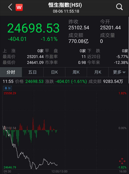 此外,港股市场也出现了普遍下跌的情况。当天上午,恒指一度跳水超400点,跌幅近1.8%。