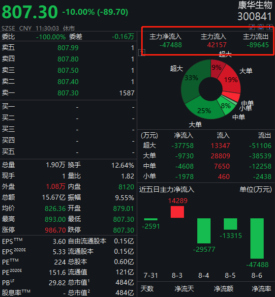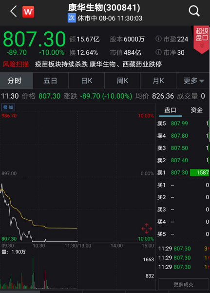 8月6日早盘,疫苗概念板块全线走弱,而其中次新股康华生物跌幅最凶猛。当天上午,康华生物低开低走,股价快速下冲,不到一个小时,康华生物的股价就封上了跌停板。