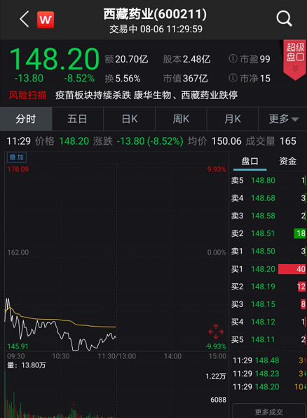 除了康华生物之外,另一只疫苗大牛股也出现了盘中跌停的情况。截至午盘,西藏药业跌超8%。