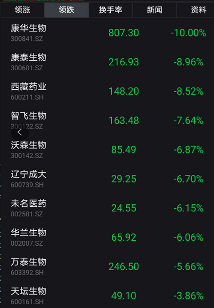 板块内,超11家概念个股下跌,仅2家飘红。同时康泰生物、沃森生物、智飞生物等跌超6%以上。