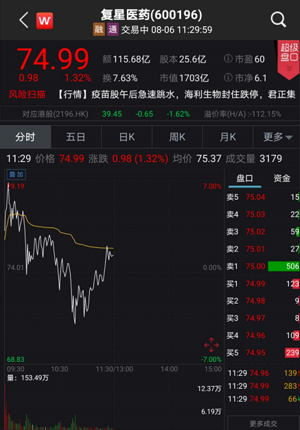 而今日早盘,受利好消息影响,复星医药早盘出现过快速拉升的态势,但奈何板块集体下探,复星医药盘中翻绿,当天上午,振幅超12%以上。截至午盘,复星医药收红涨1.3%。