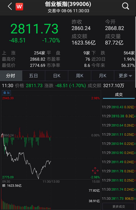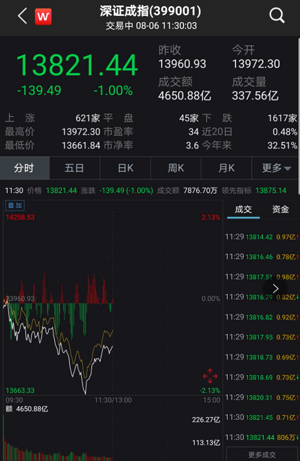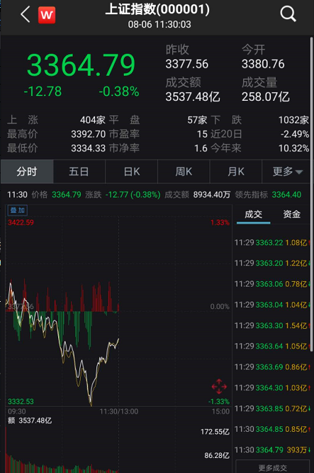8月6日上午,A股三大指数悉数飘绿,其中沪指一度跌超1%以上,截至午盘,跌幅收窄至0.38%。