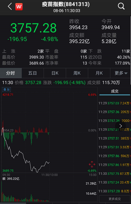 当天上午,疫苗股指数盘中低开低走,并全线走弱,盘中指数跌超6%以上。截至午盘,指数跌近5%。