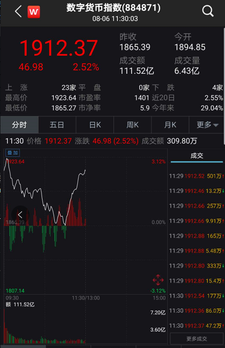 而数字货币概念也一度领涨市场。截至午盘,数字货币指数涨超2%以上,其中数字认证涨停。