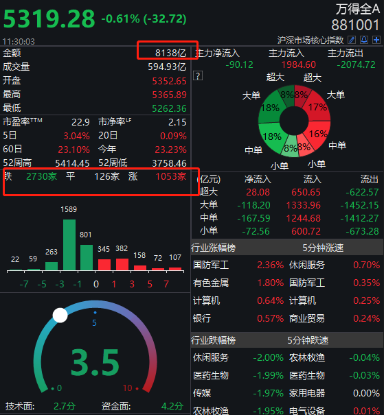 从交投情况看,短短半日,两市成交依然高达8000亿元,意味着万亿成交的行情格局仍可能持续。不过,当天上午,两市超2700只个股集体飘绿,22只个股跌停,场内情绪指数仅为3.4。