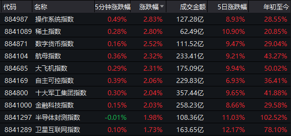 另一方面,昨日强势主题稀土指数、数字货币指数、大飞机指数、航母指数依旧维持热度,涨幅居前。