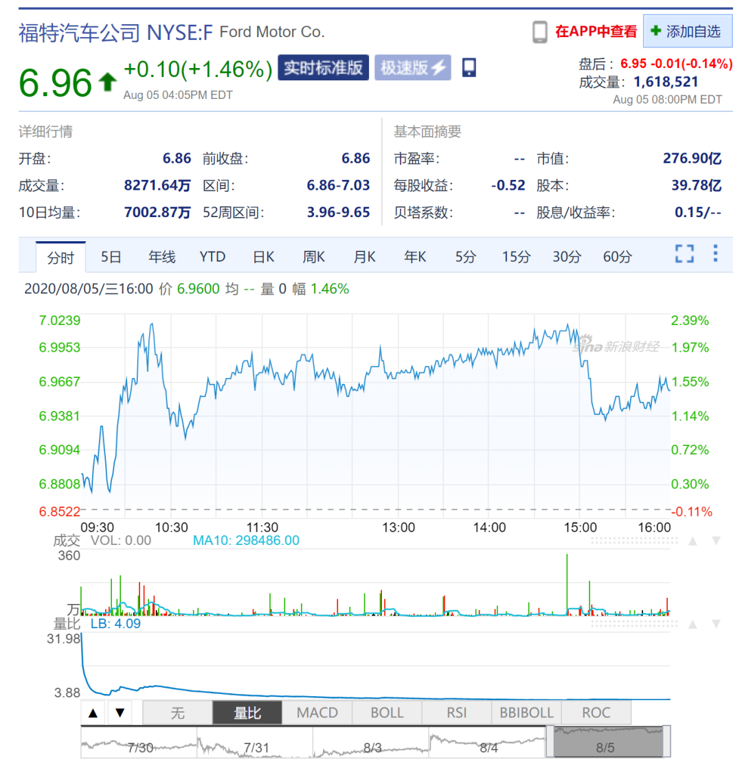 值得一提的是,在继任计划发布后的8月4日,福特股价飙升了3%以上,收盘时报收6.77美元。截至美东时间8月5日收盘,福特汽车股价上涨1.46%,报收6.96美元,市值为276.90亿美元。