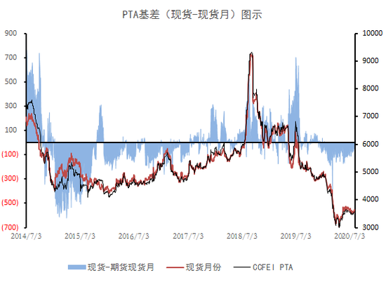 而促使仓单快速注册的原因正是我们从PTA的基差图示中看到的PTA的基差走弱,现货端的疲弱使得现货低于期货盘面,尤其是6月12日附近,期货盘面给出了市场较为合理的无风险套利价格,在高库存、需求疲弱的背景下,吸引较多的套保盘在期货市场进行套期保值。这一操作,在现货市场订单难求的背景下,为企业解决了销售难题,同时及时有效回笼资金。