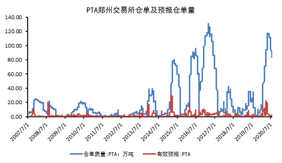 今年在需求端因新冠疫情影响恢复乏力,供给端产能高速增长的背景下,PTA社会库存创历史新高水平、PTA价格创出历史新低。天量库存该如何消化,这是接下来留给市场需要解决的问题。从下图中我们可以看到交易所的仓单在今年6月12日一度达到227061张,折合113.53万吨巨量交易所库存。