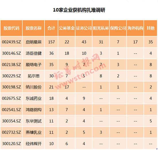 iFinD数据显示,个股方面,启明星辰累计接待机构达157家,位居首位;汤臣倍健、顺络电子分累计接待36家、35家机构,分别排名第二、第三位。