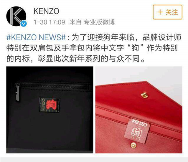 KENZO为了彰显狗年新年系列产品的“与众不同”,在包包上特地缝了一个“狗”字;